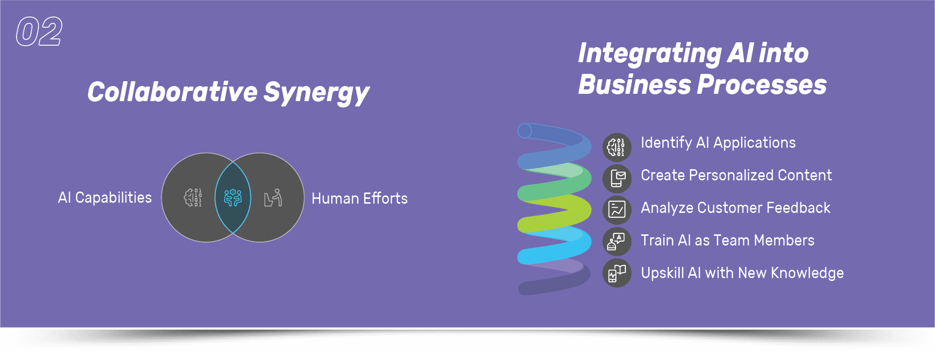 Treat AI as part of your team, and use it to enhance human creativity and efficiency. Identify areas where AI can supplement your team’s efforts, whether it’s by generating ideas, analyzing trends, or personalizing customer interactions. Identify high-impact areas where AI can collaborate with human efforts, such as: